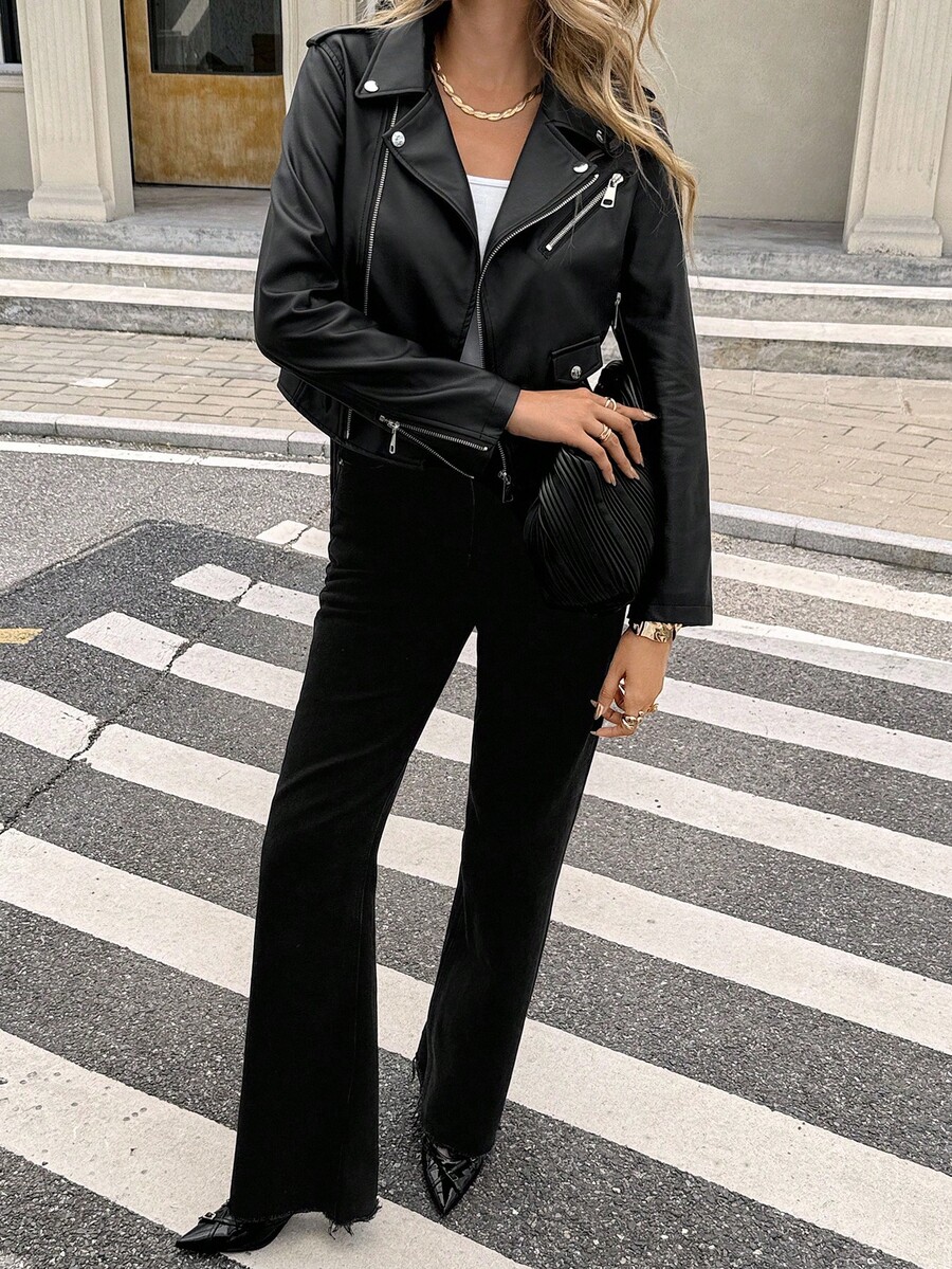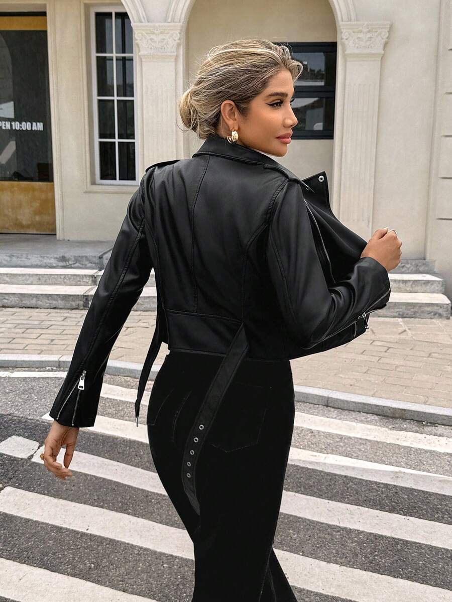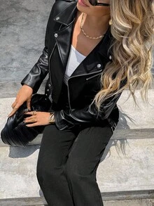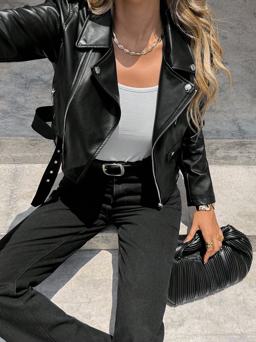 Chaqueta de cuero sintético con cremallera frontal, cuello con muesca y cinturón para otoño/invierno