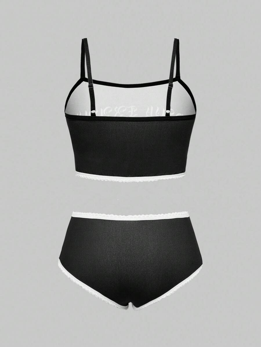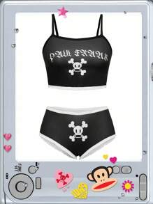 Paul Frank X ROMWE Conjunto de camiseta y pantaleta con estampado de calavera y aplicaciones de encaje para mujer