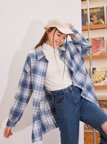 Camisa de botones con hombros caídos a cuadros, ropa de otoño, franela, blusa de manga larga para mujer