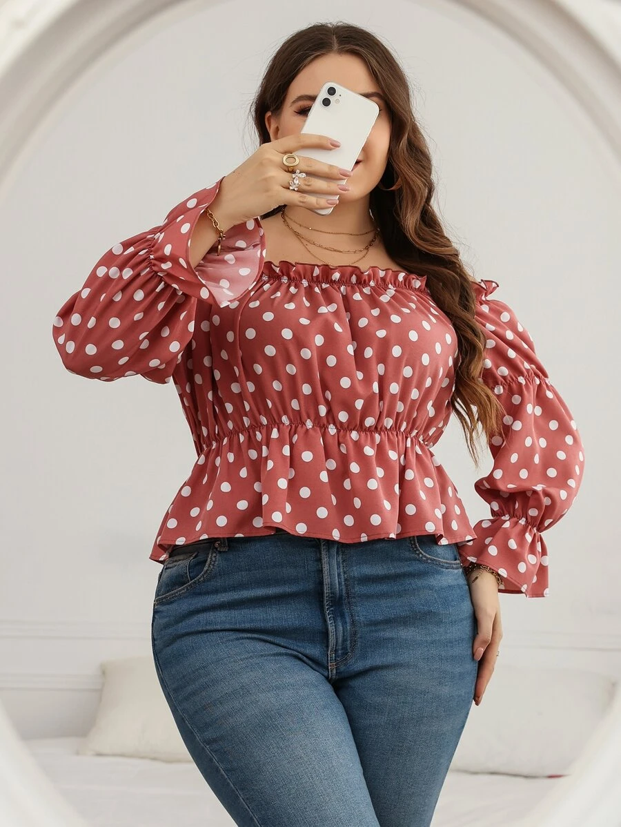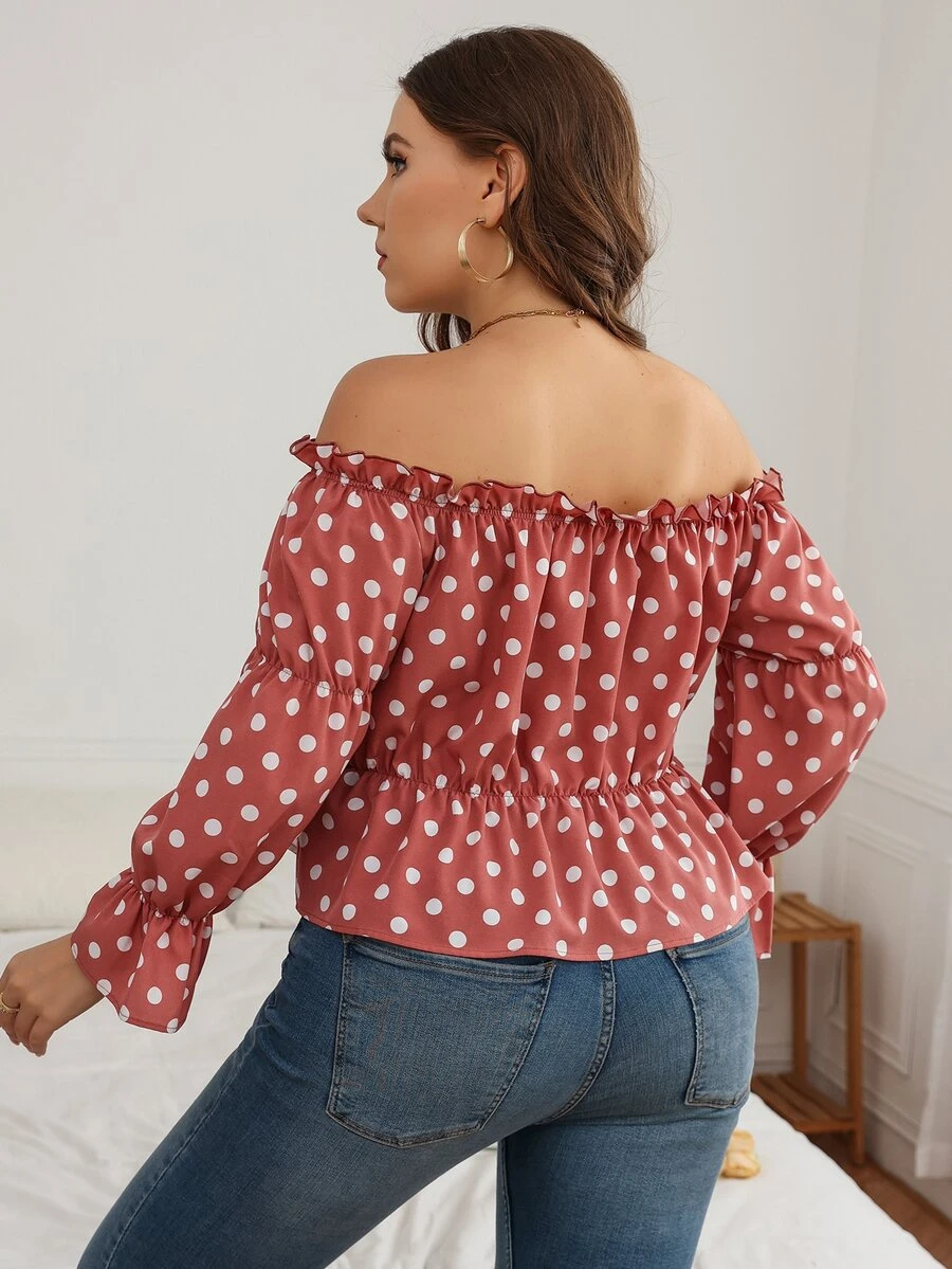 Blusa peplum de lunares fruncido de hombros descubiertos de manga con volante