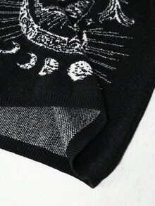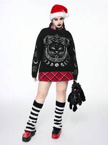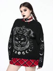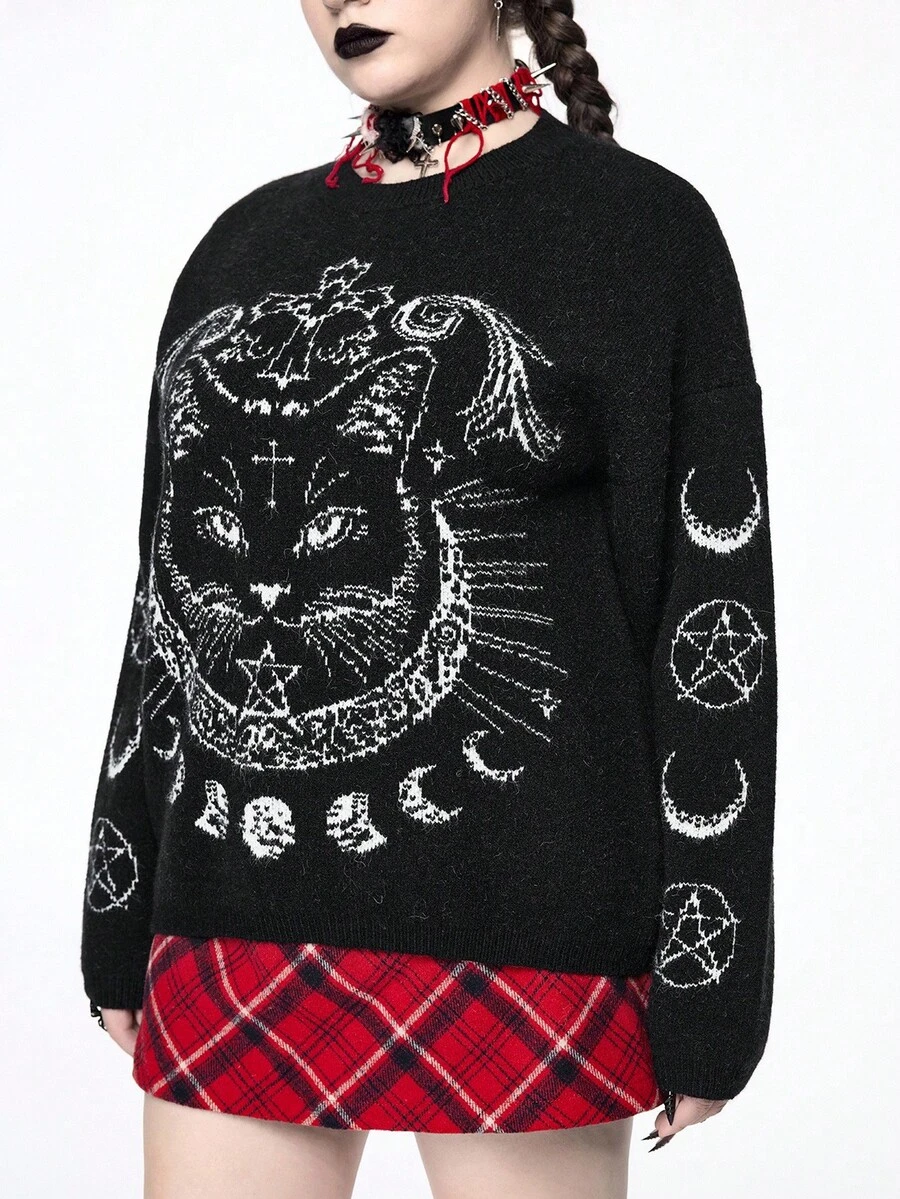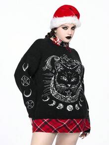 Goth Suéter holgado de Navidad con estampado de gato, luna y cruz, de talla grande, Suéter de manga larga de otoño/invierno para mujer de talla grande, Suéter holgado con estampado de gato, estrella y luna, de talla grande para mujer, Suéter de talla grande para mujer
