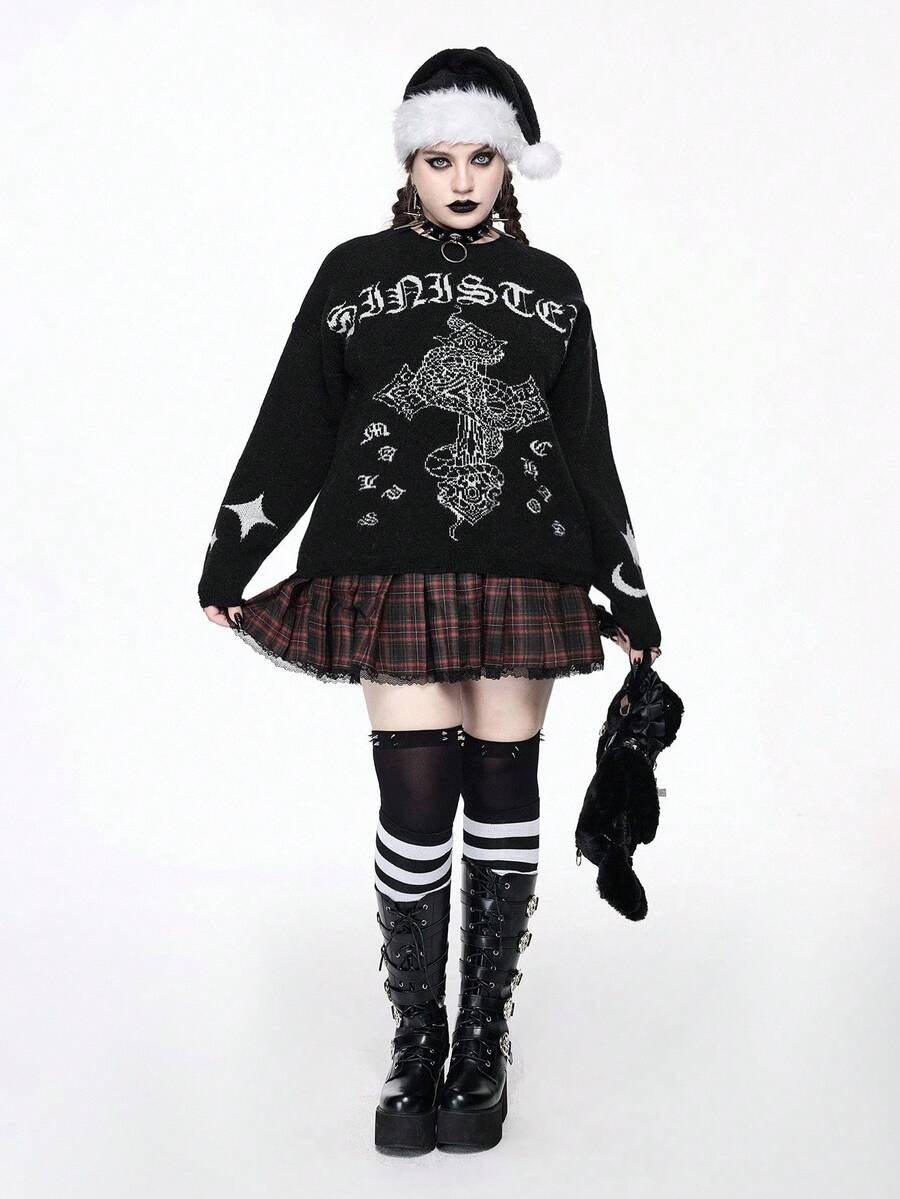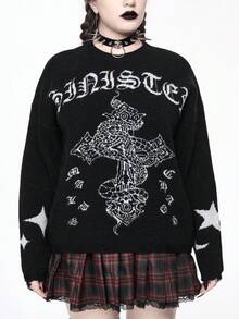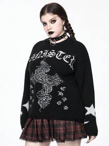Goth Suéter negro de talla grande con estampado gótico de cruz, serpiente, símbolo latino, estrella y luna, estilo gótico callejero de otoño/invierno de talla grande, suéter negro de manga larga de punto de talla grande, cárdigan de punto de talla grande para otoño/invierno, ropa de mujer de talla grande para Halloween, Navidad y días festivos, estilo gótico, casual, ropa de calle, suéter de mujer de talla grande