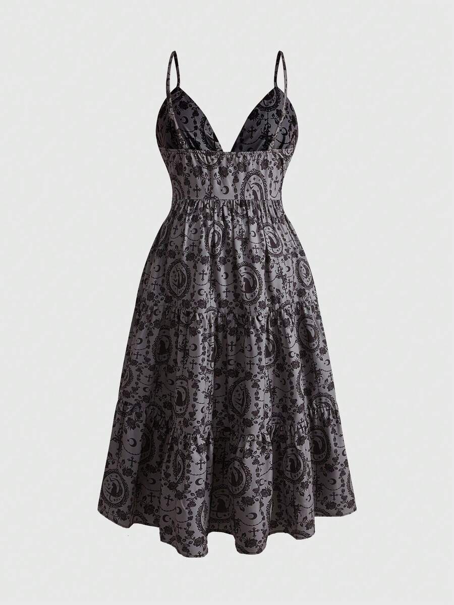 Goth Vestido de talla grande con estampado gótico de rosa misteriosa, cruz, gato, luna y estrella