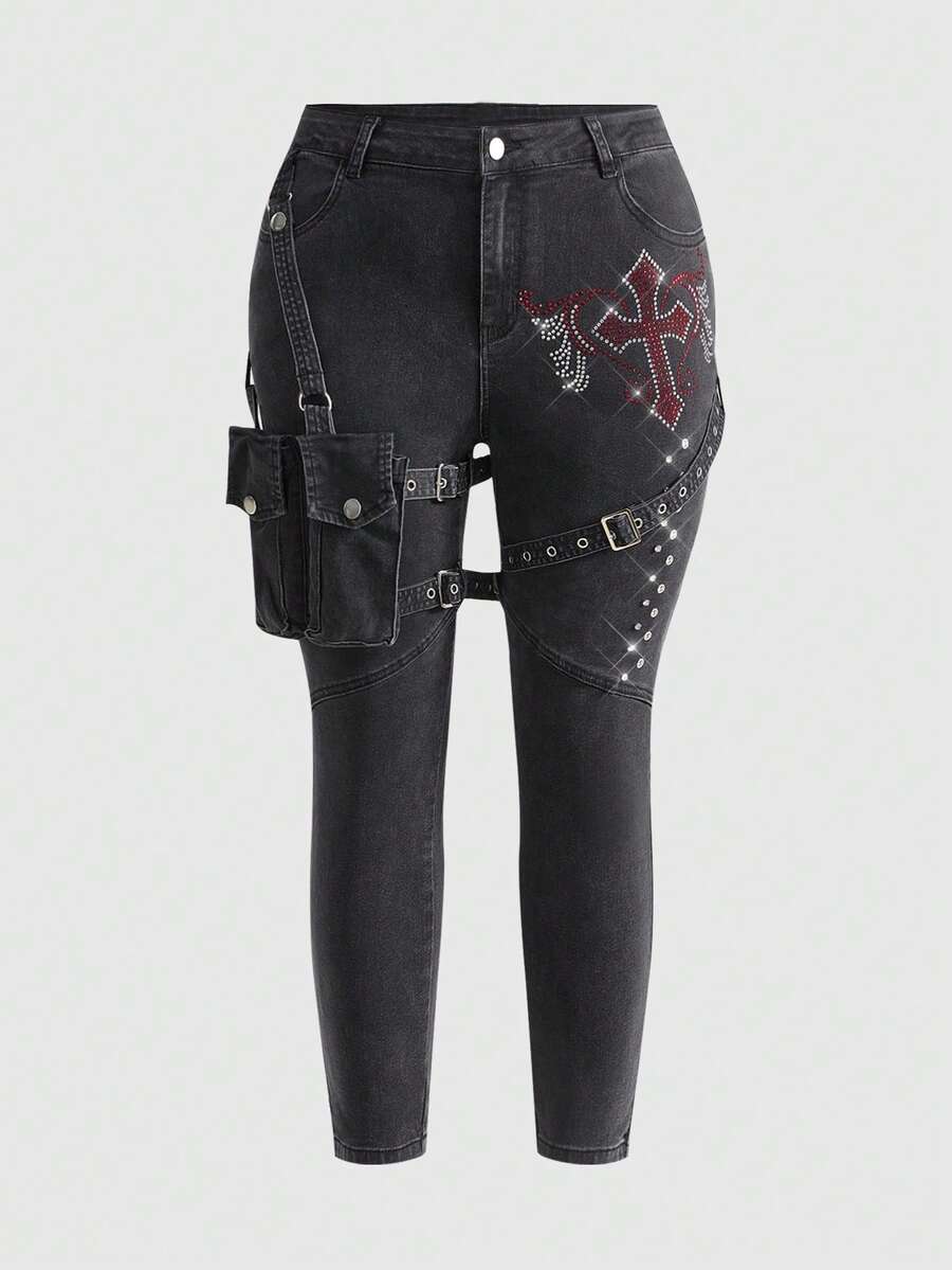 Goth Jeans de mezclilla vintage desgastados con bolsillo asimétrico de carga, correa, alas de ángel con cristales, estilo gótico, talla grande, pantalón largo casual de calle para otoño/invierno, talla grande