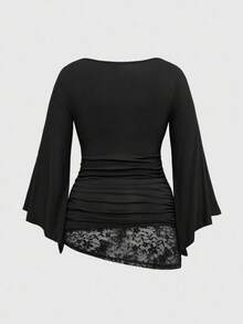 Goth Camiseta de mujer de manga de murciélago suelta con cuello de escote y adorno de encaje para tallas grandes