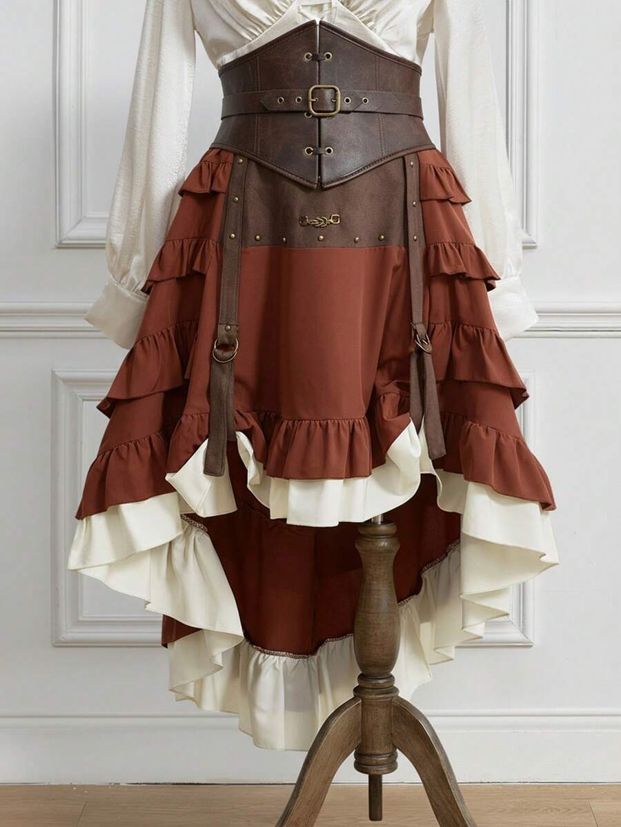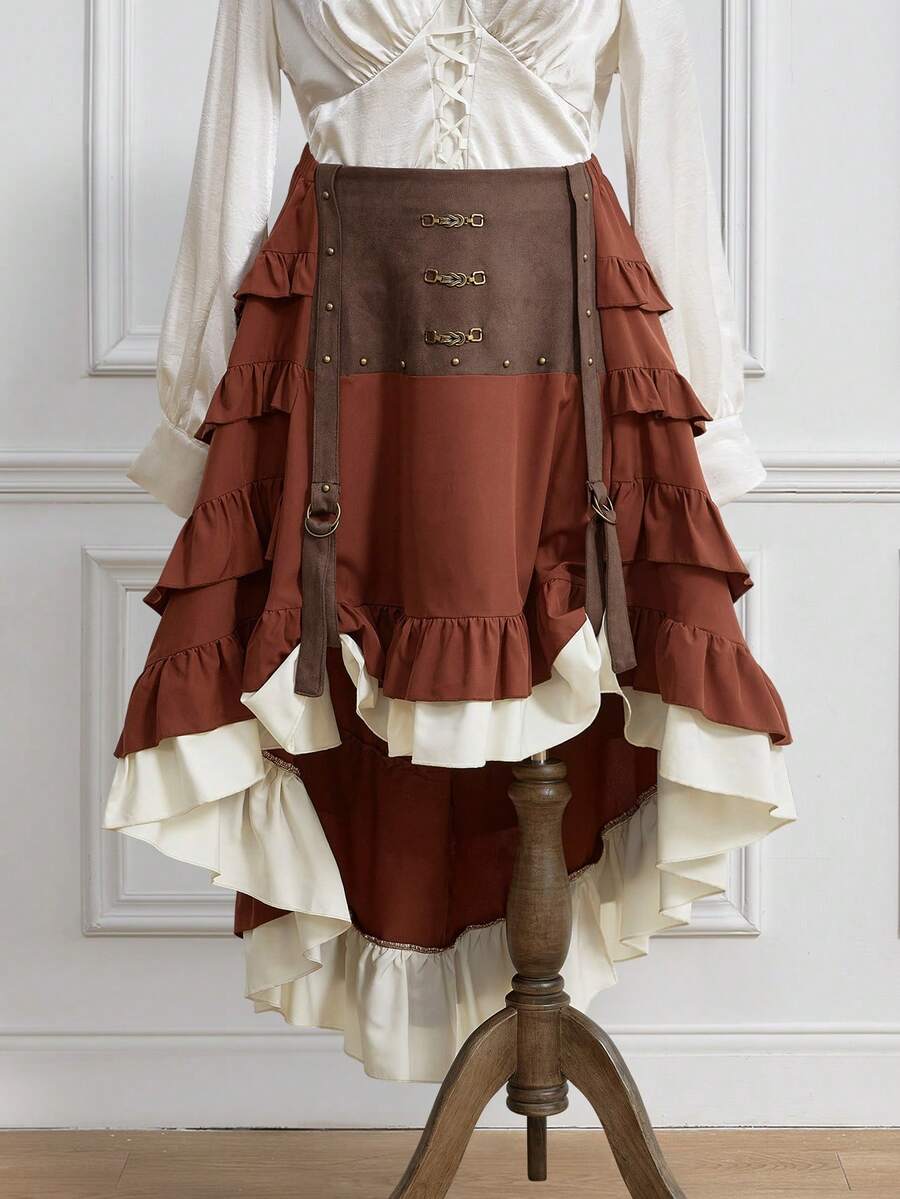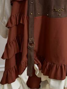 ROMWE Avant Vestido elegante y vintage de estilo medieval para tallas grandes, falda marrón con parches de gamuza sintética, volantes en la cintura y bajo, falda formal de gran tamaño para fiestas de otoño/invierno, estilo retro de palacio para damas
