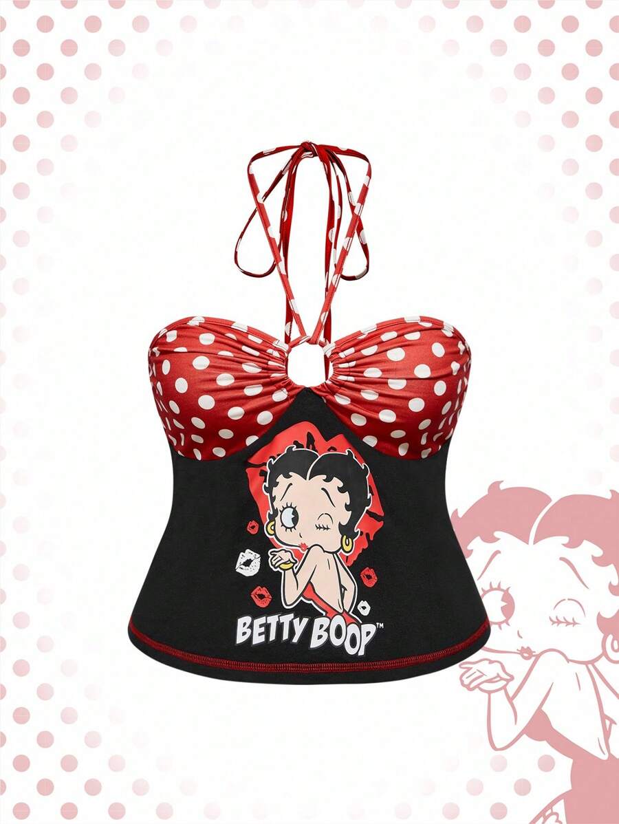 Betty Boop | ROMWE Top halter de lunares en contraste con gráfico de dibujos animados sexy y lindo para tallas grandes en verano
