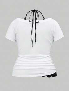 J-Fashion Camiseta blanca de cuello en V y halter con nudo para mujer, de talla grande, con estampado gráfico retro de la calle estadounidense en estilo Y2K sexy