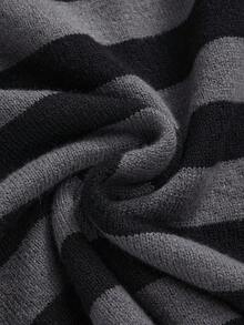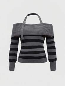 Grunge Punk Suéter de cuello alto a rayas negro y gris talla grande, suéter de manga larga con escote halter sexy y calado para mujer, blusas de talla grande para mujer en otoño/invierno