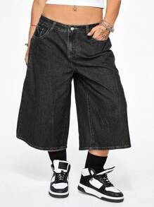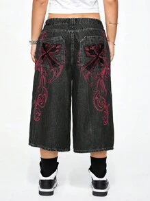 Grunge Punk Pantalones cortos capri de mezclilla holgados de talle bajo con bordado floral en el bolsillo trasero, estilo vintage de calle para tallas grandes