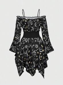 Goth Vestido maxi con hombros descubiertos, estampado floral y bajo asimétrico con cinturón para mujer de talla grande', 'translate_es':'Vestido maxi de talla grande con estilo gótico, cintura con lazo y tirantes para otoño/invierno', 'translate_es':'Vestido de talla grande con estampado de estrellas y lunas negras para mujer, para otoño