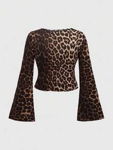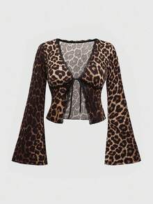 J-Fashion Conjunto de 2 piezas de mujer talla grande: Cárdigan con lazo de cinta con estampado de leopardo vintage Y2K y shorts con volantes en el bajo