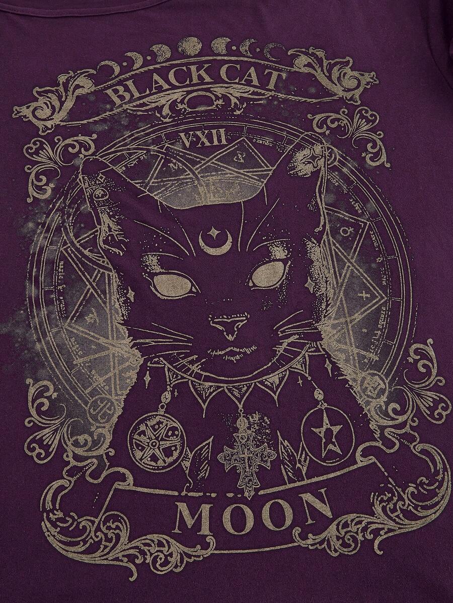 Goth Camiseta de manga corta holgada de gato negro misterioso de talla grande para mujer, color morado oscuro