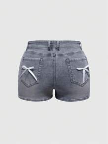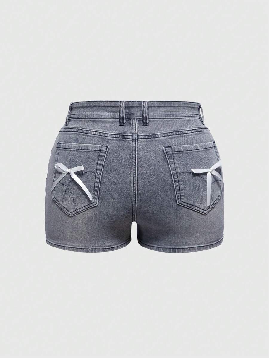 Kawaii Shorts de mezclilla gris elásticos con decoración de moño para mujer talla grande, verano