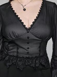 EDITION Blusa de encaje con cuello en V oscuro y parches en la cintura para mujer de talla grande, ideal para Halloween