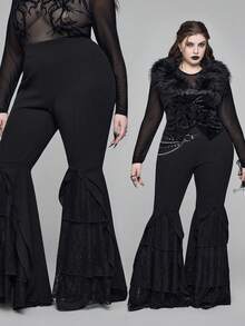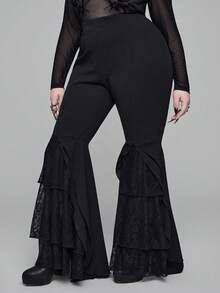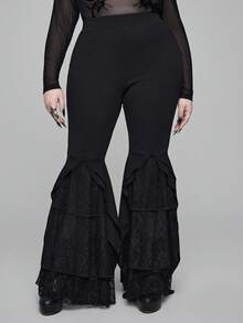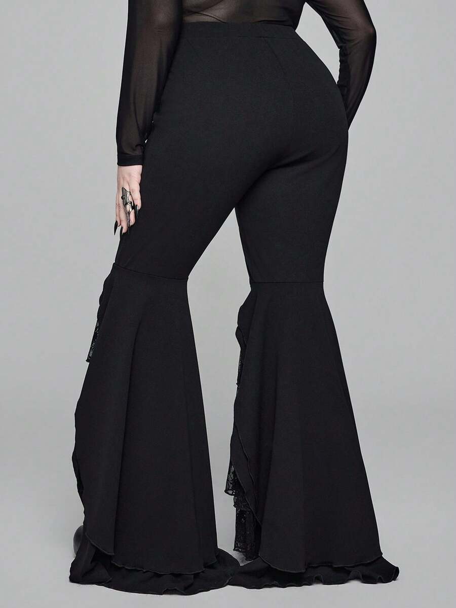 EDITION Pantalones acampanados de estilo gótico para mujer de talla grande con dobladillo de encaje con volantes en capas y diseño de abertura, de gran elasticidad
