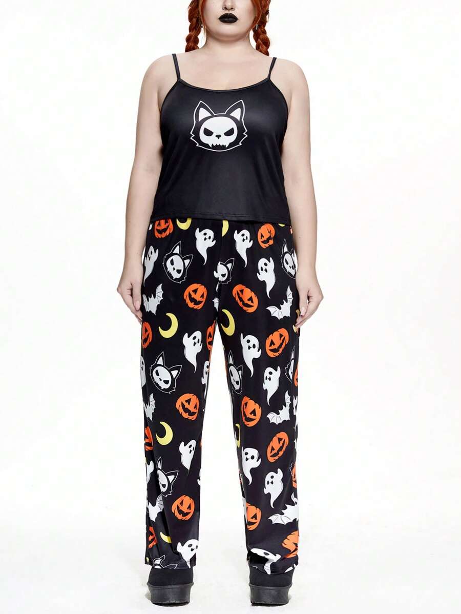 Conjunto de pijama de top de tirantes y pantalones de talla grande para mujer con estampados de gato negro, calabaza, fantasma, murciélago y luna en Halloween