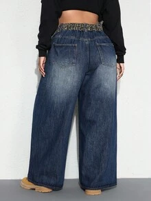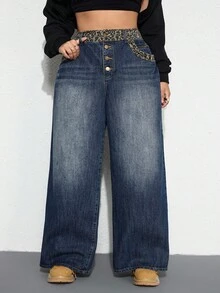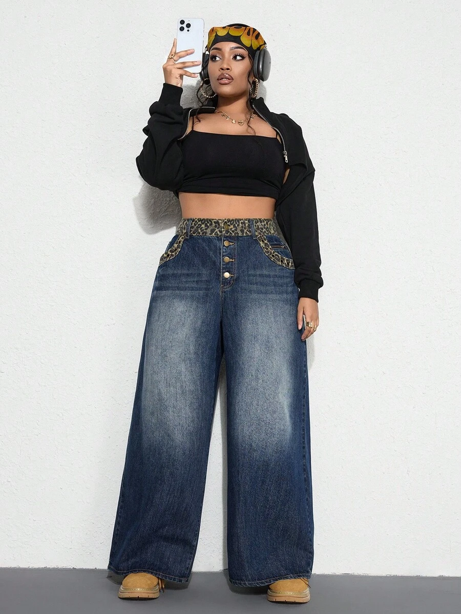 Grunge Punk Jeans acampanados de talle bajo, holgados, con diseño de parches de estampado de leopardo vintage para mujer de talla grande
