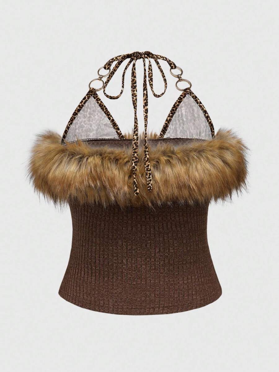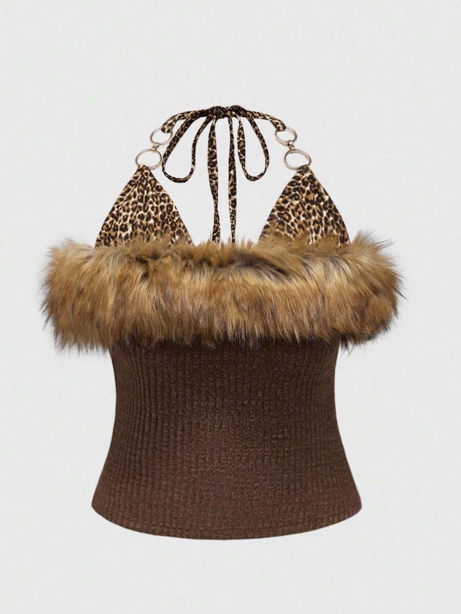J-Fashion Top camisola de talla grande con tirantes de espagueti, sexy, con estampado retro patchwork y peludo, estilo Y2K