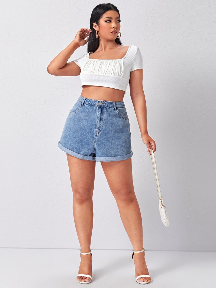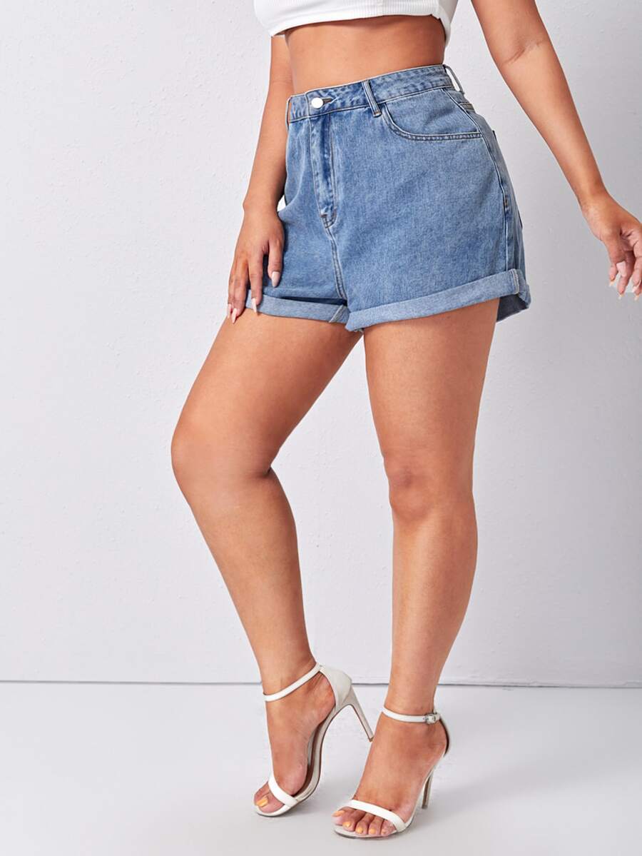 Shorts de mezclilla con bolsillos inclinados de talla grande y dobladillo enrollado, shorts estilo 'mamá'