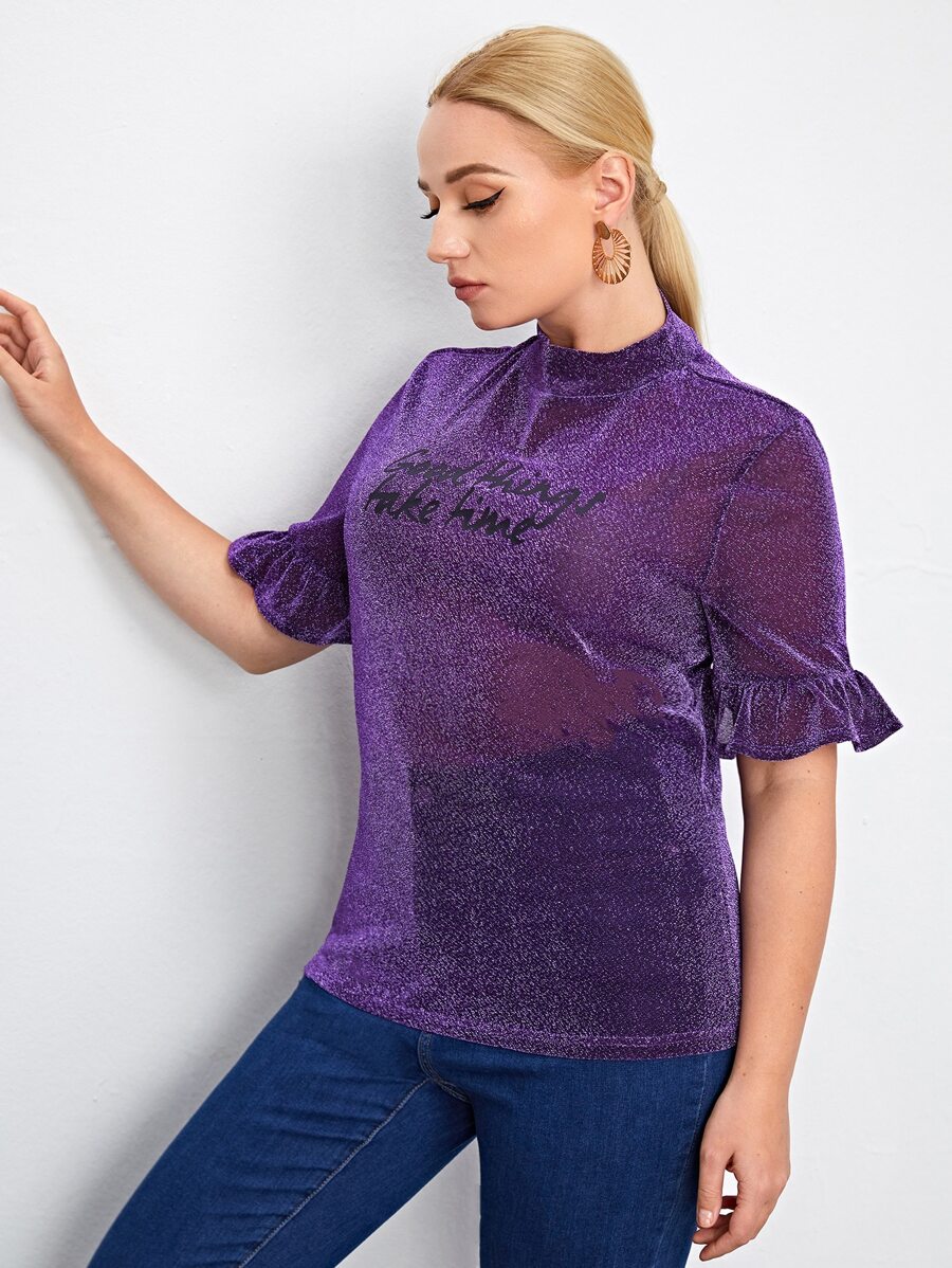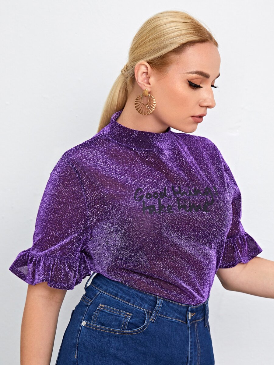 Top brillante de manga con volante con estampado de slogan-grande