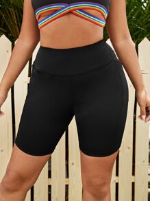 Shorts deportivos unicolor de cintura ancha con bolsillo de celular