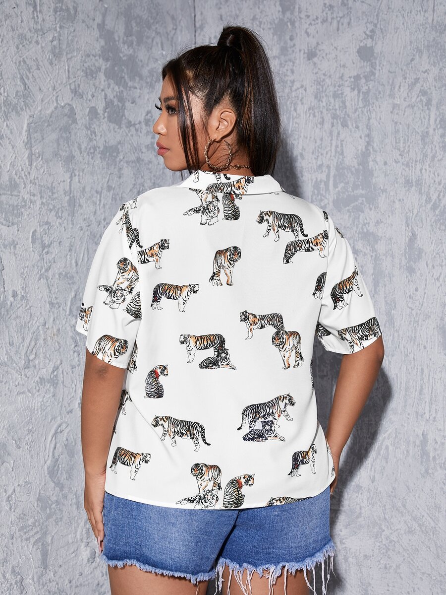 Blusa con estampado de tigre de cuello con solapa con botón