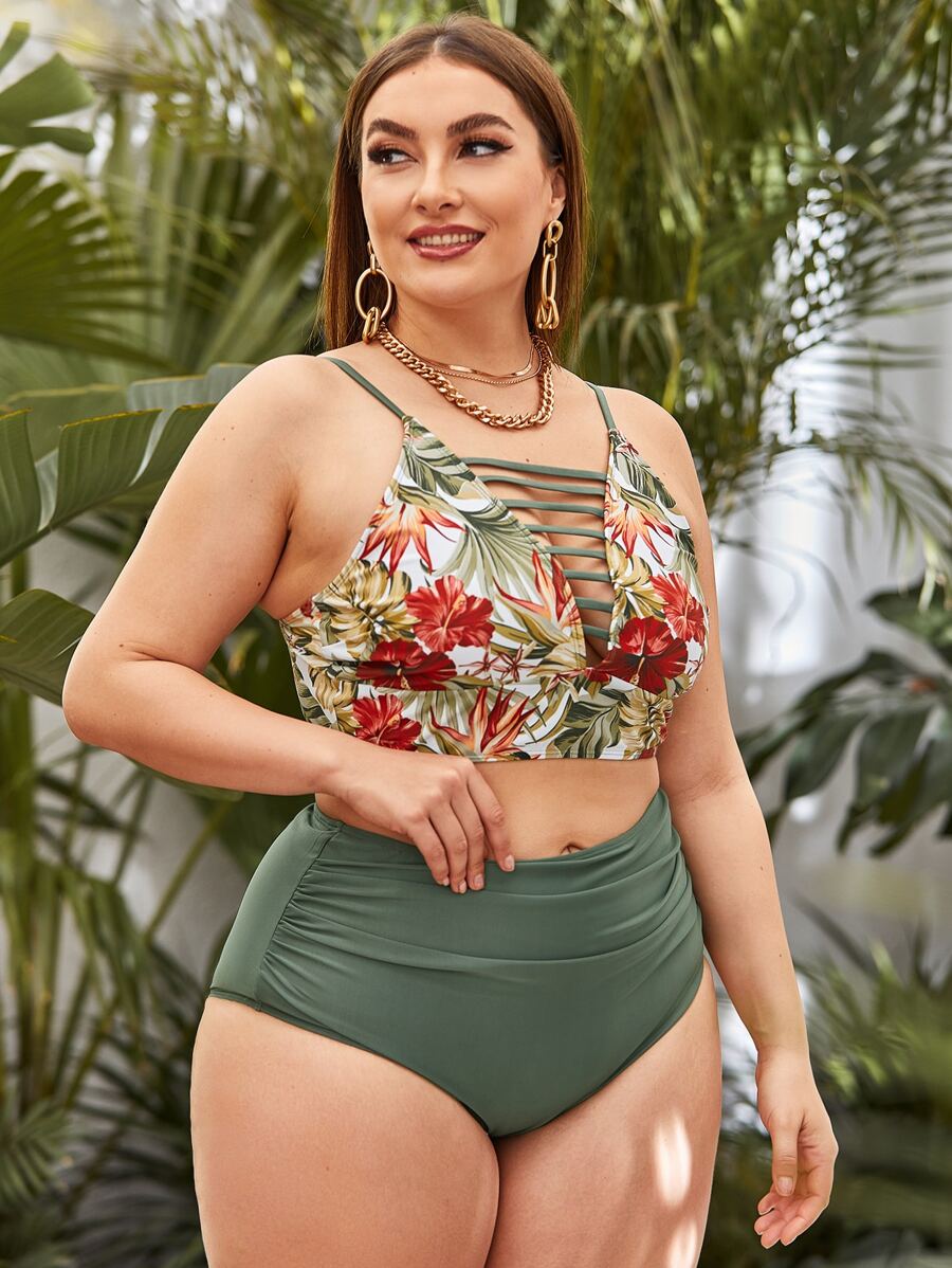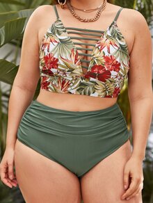 Conjunto de bikini tropical de talla grande con parte superior de cami con abertura en escalera y bottom fruncida de talle alto, traje de baño de 2 piezas