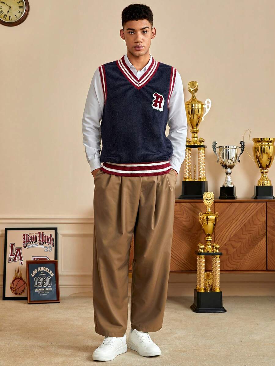 Prep Hombres Chaleco de punto con bordado de letra ribete de rayas sin camisa