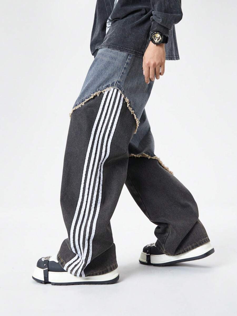 Prep Jeans casuales de pierna recta para hombre con rayas y desgaste en los lados