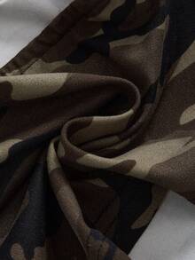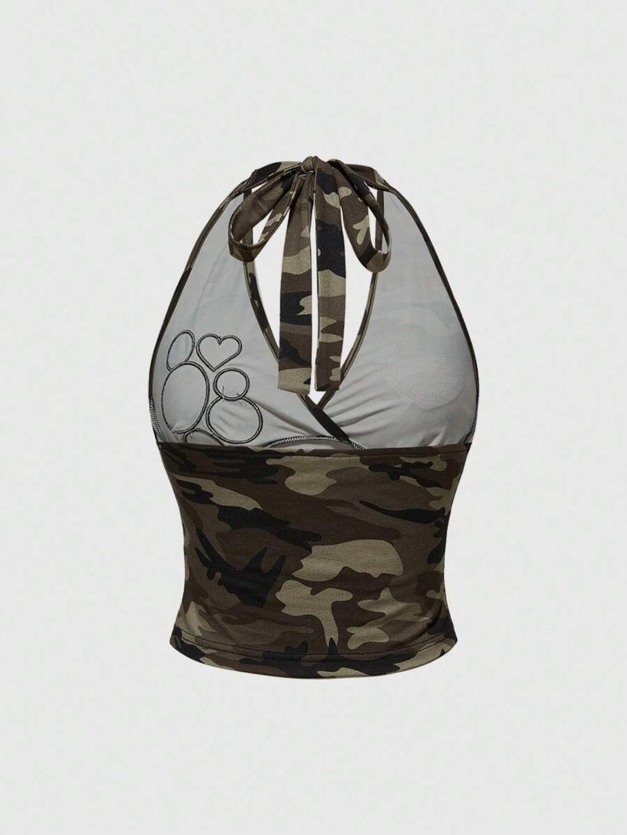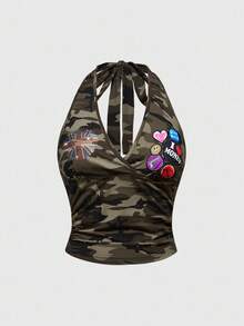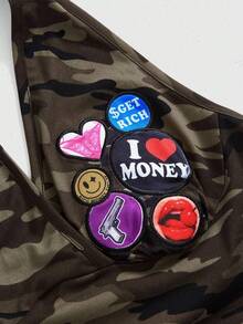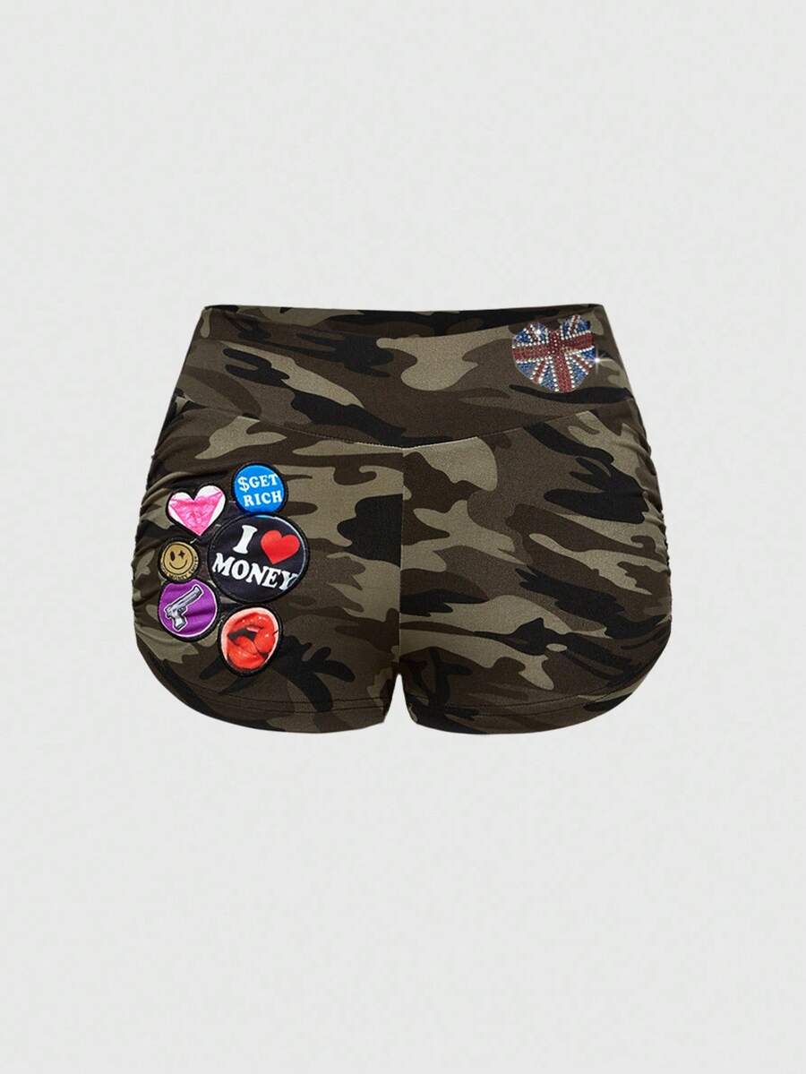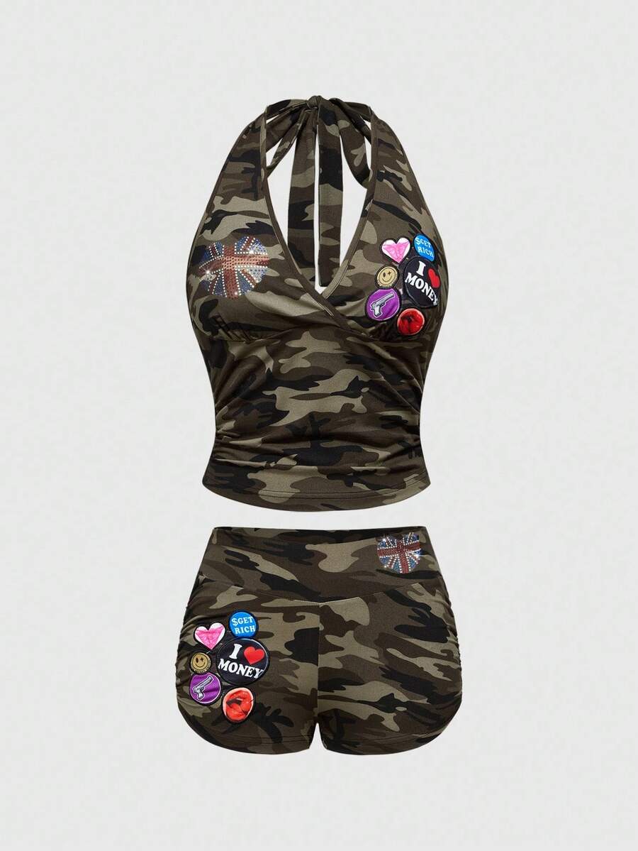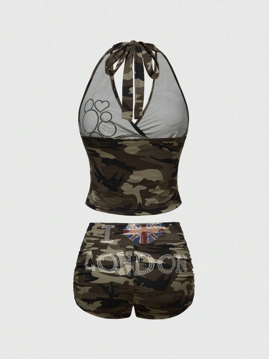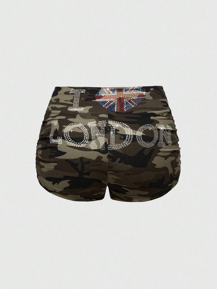 ROMWE Avant Conjunto de top corto con aplicaciones de strass y pantalones cortos de tiro bajo con parche de bandera inglesa y camuflaje retro del milenio para mujer, 2 piezas