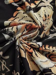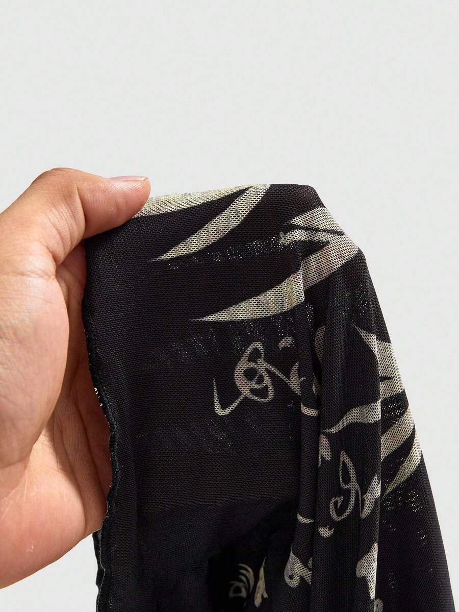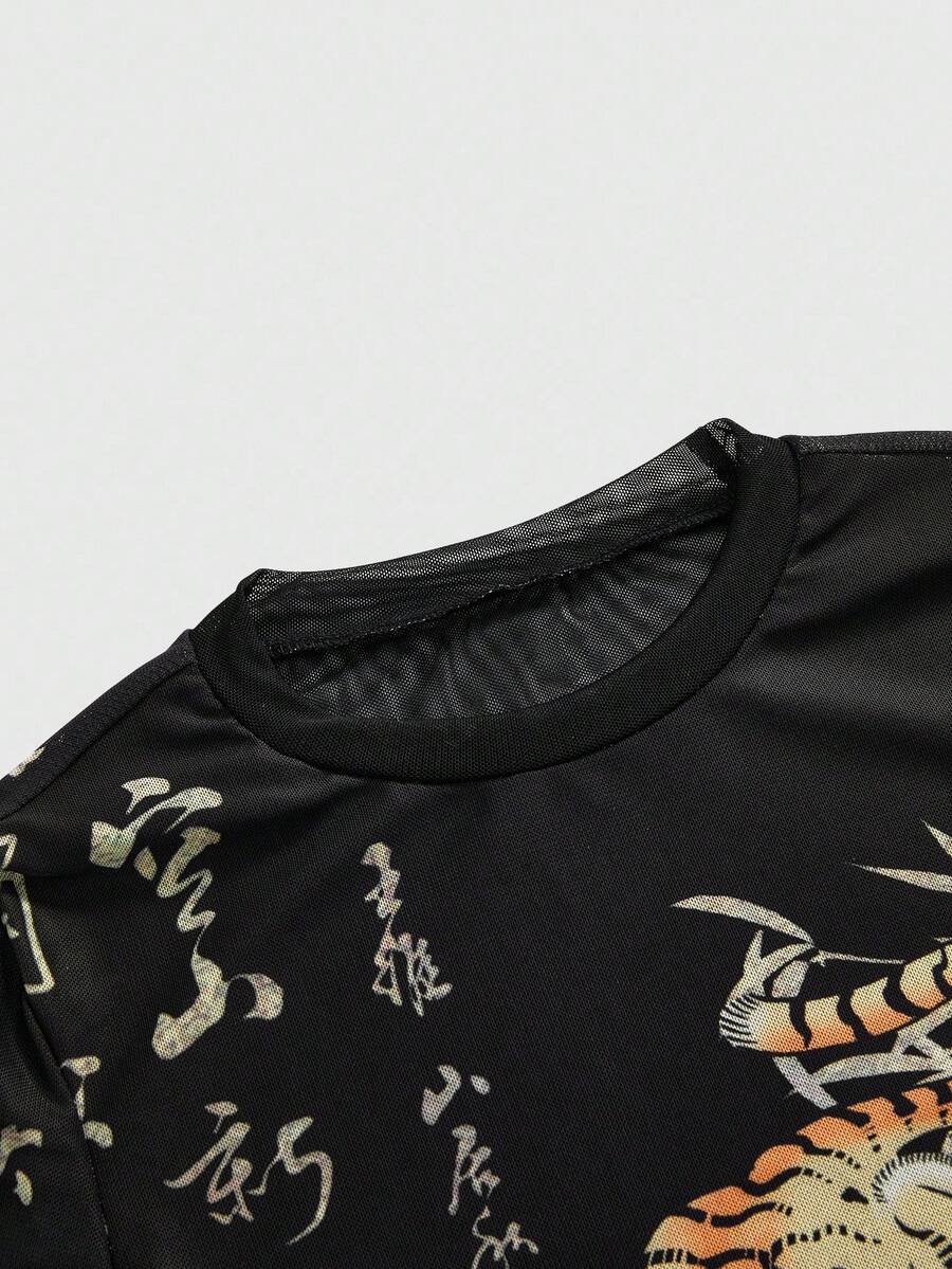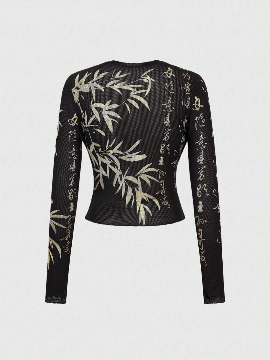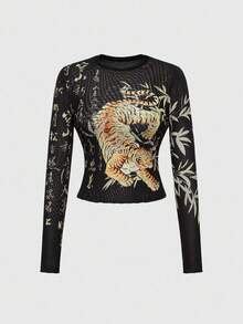 ROMWE Avant Blusa transparente con estampado de caligrafía de tigre y hojas de bambú de estilo chino