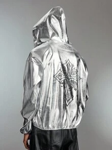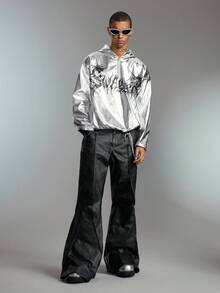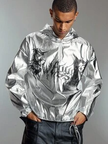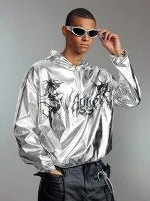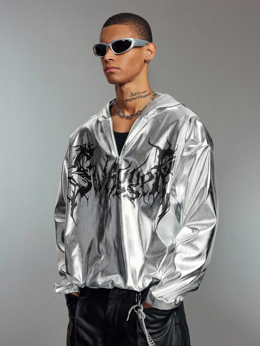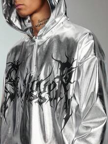 ROMWE Avant Sudadera con capucha de manga larga con estampado de letras, hombros caídos y media cartera con cremallera para hombres