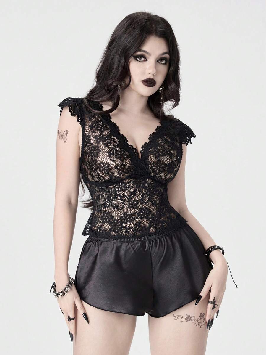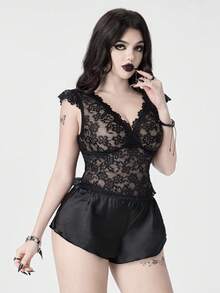 ROMWE Avant Conjunto de lencería de satén transparente y encaje para mujer
