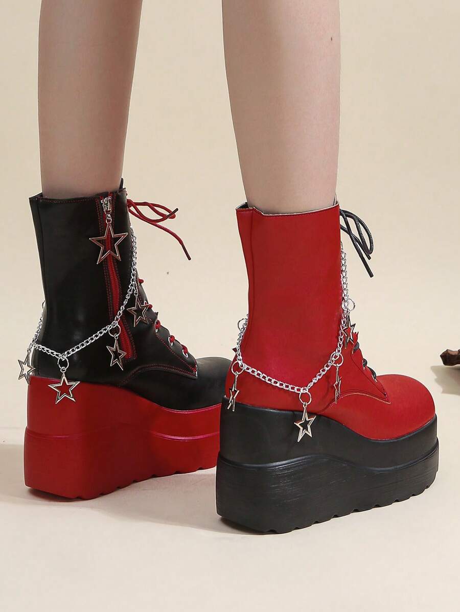 ROMWE Avant Botas de cuña delanteras con cordones y decoración de cadena de estrellas de dos tonos para mujer, Botas de moda al aire libre geniales