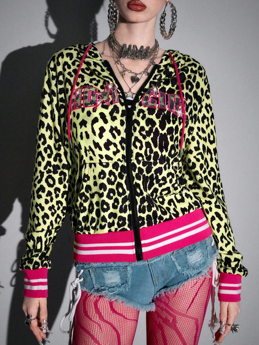 ROMWE Avant Sudadera con capucha con orejas de animal, bordado con piedras rhinestone, lazo en la parte posterior y color verde neón sexy para mujeres, estilo subcultura Y2K
