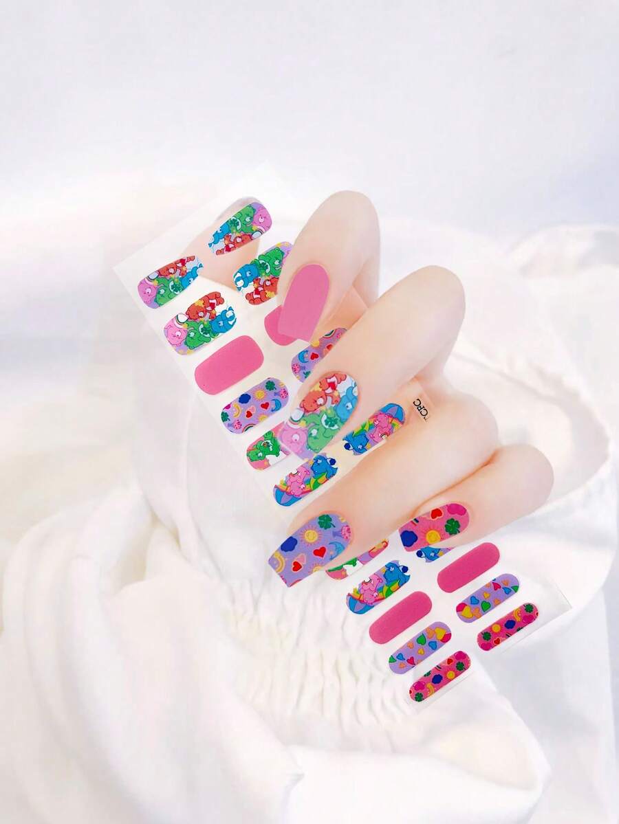 ROMWE X Care Bears 22 piezas con patrón de oso de dibujos animados Uña postiza Pegatina