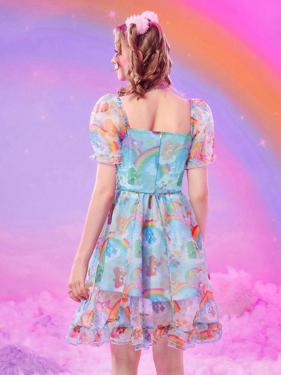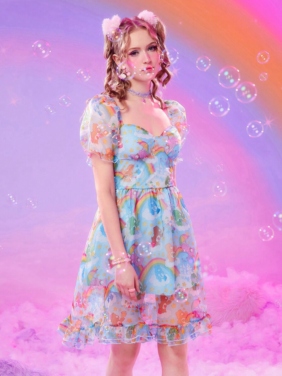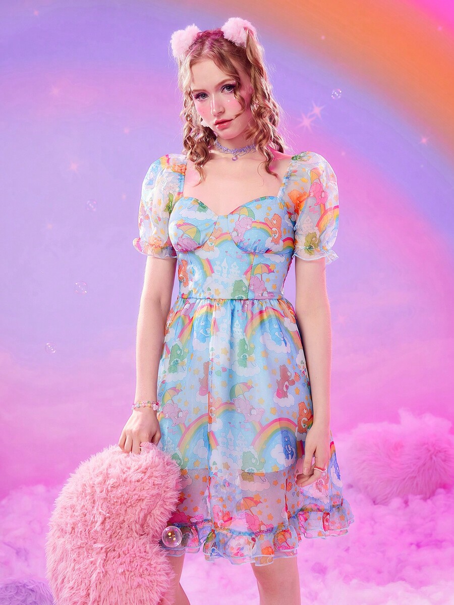 ROMWE X Care Bears Vestido con estampado de dibujos animados escote corazón de manga farol bajo con fruncido