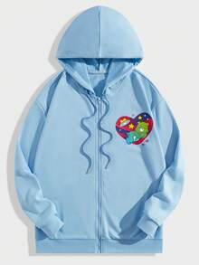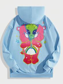 ROMWE X Care Bears Hombre Con Capucha, Sudadera Con Cremallera, Patrón De Dibujos Animados Y Cordón