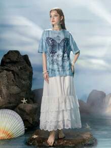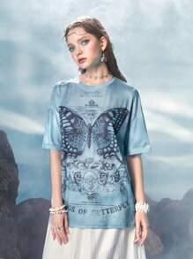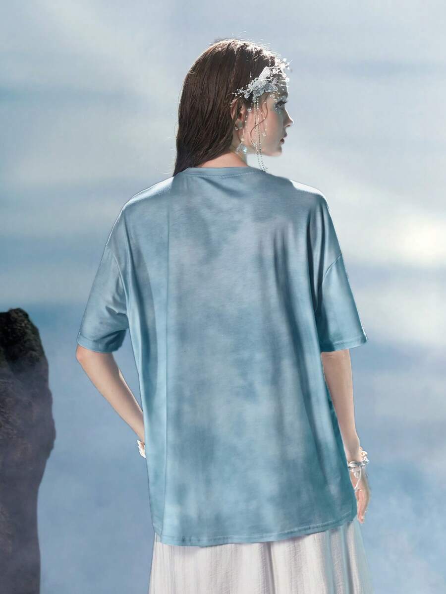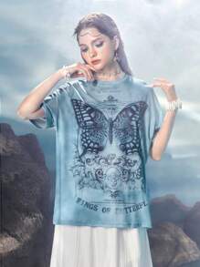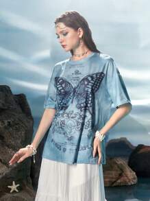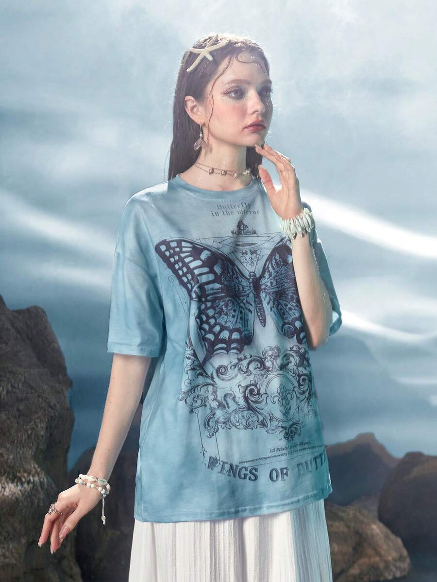 Fairycore Sirena Camiseta de hombros caídos con estampado de mariposa de tie dye