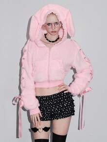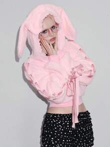 Kawaii Sudadera con capucha para mujer con decoración de lazo y encaje con orejas de conejo