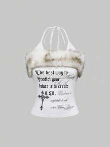 Camiseta sin mangas ajustada con estampado de letra cruzada, parches y piel sintética de estilo retro Y2K sexy