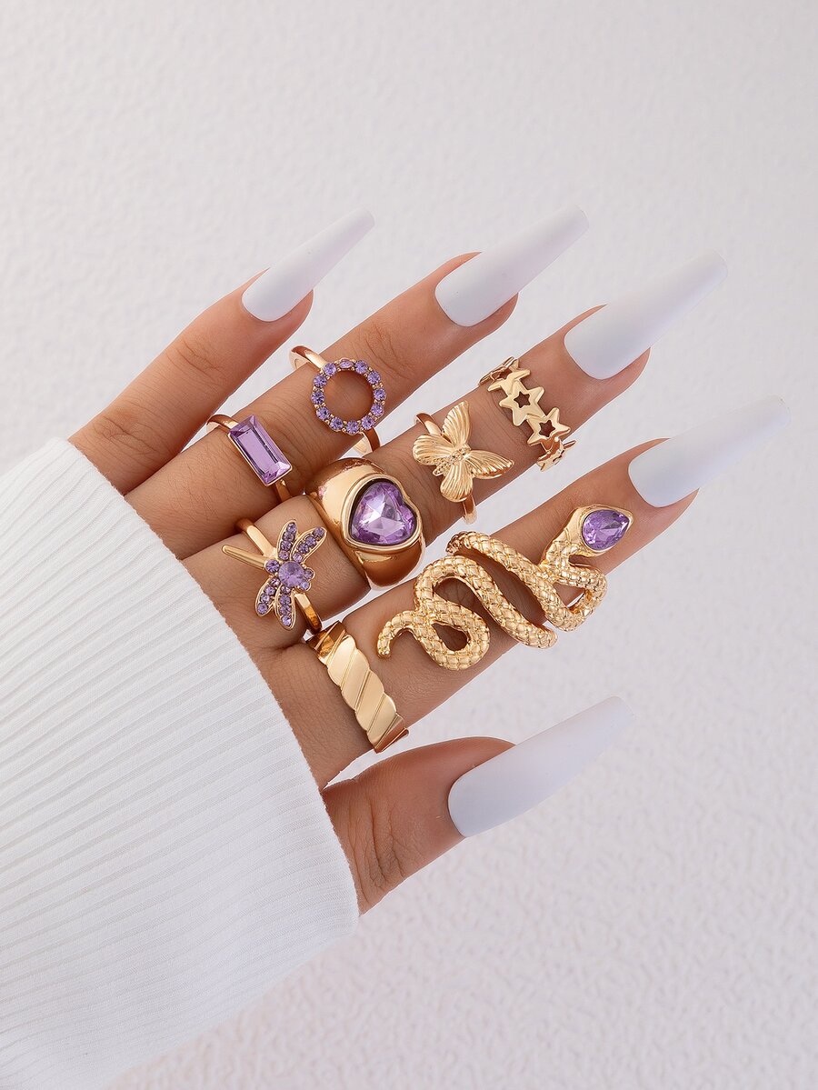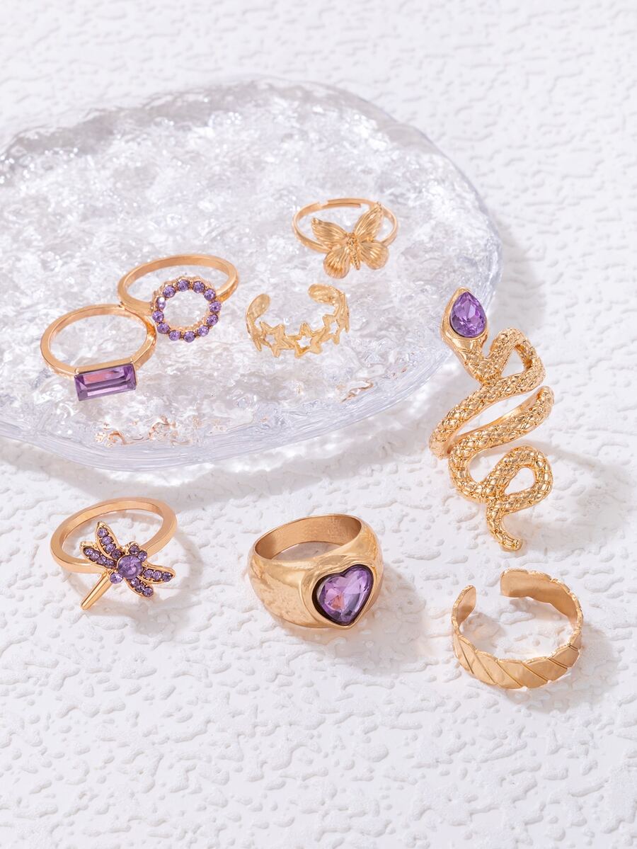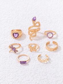 8 piezas Anillo abierto con diamante de imitación con corazón & con diseño de mariposa