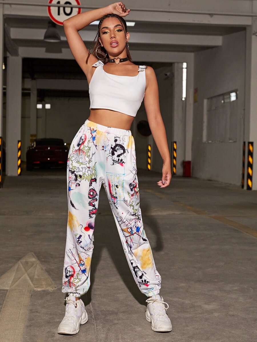 Joggers con bolsillo oblicuo con estampado de cráneo