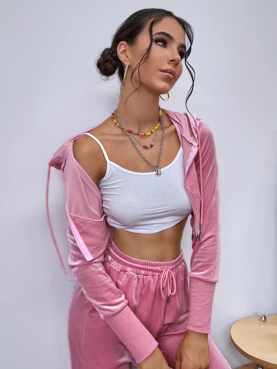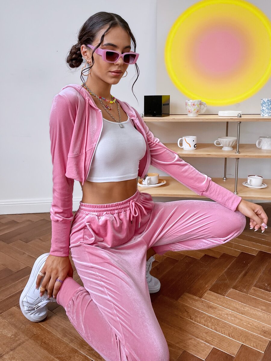 unicolor corto de terciopelo con cordón Capucha & Pantalones deportivos