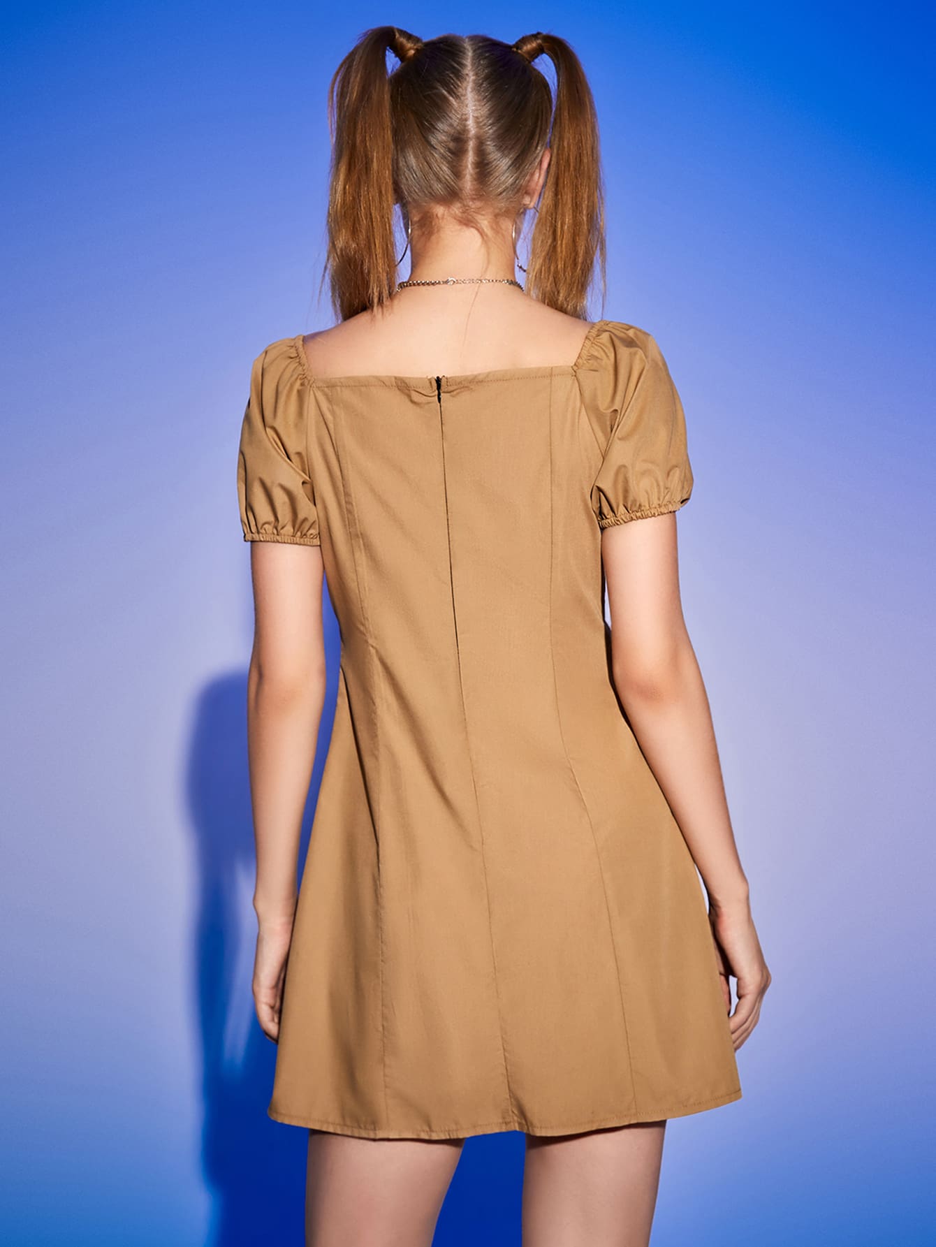 Vestido Sólido Con Mangas Abullonadas Y Decoración De Cordones