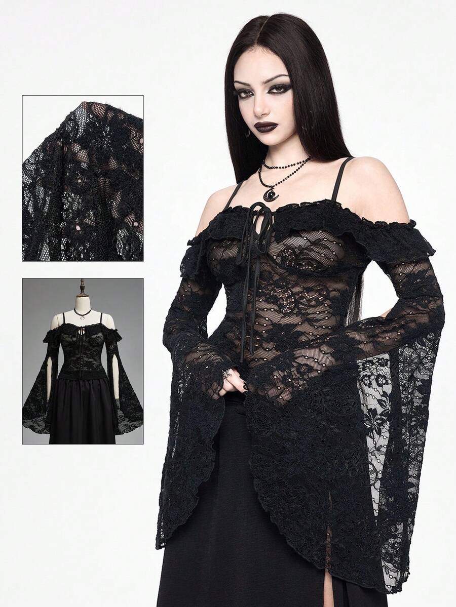 Goth Blusa de mujer con mangas acampanadas, hombros descubiertos y encaje transparente con estilo gótico