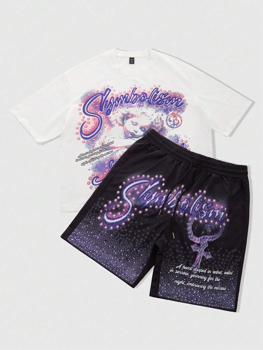Street Life Set de 2 piezas de camiseta de manga corta y pantalones cortos con estampado religioso estilo Y2K para hombres, adecuado para uso diario en primavera/verano