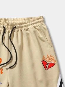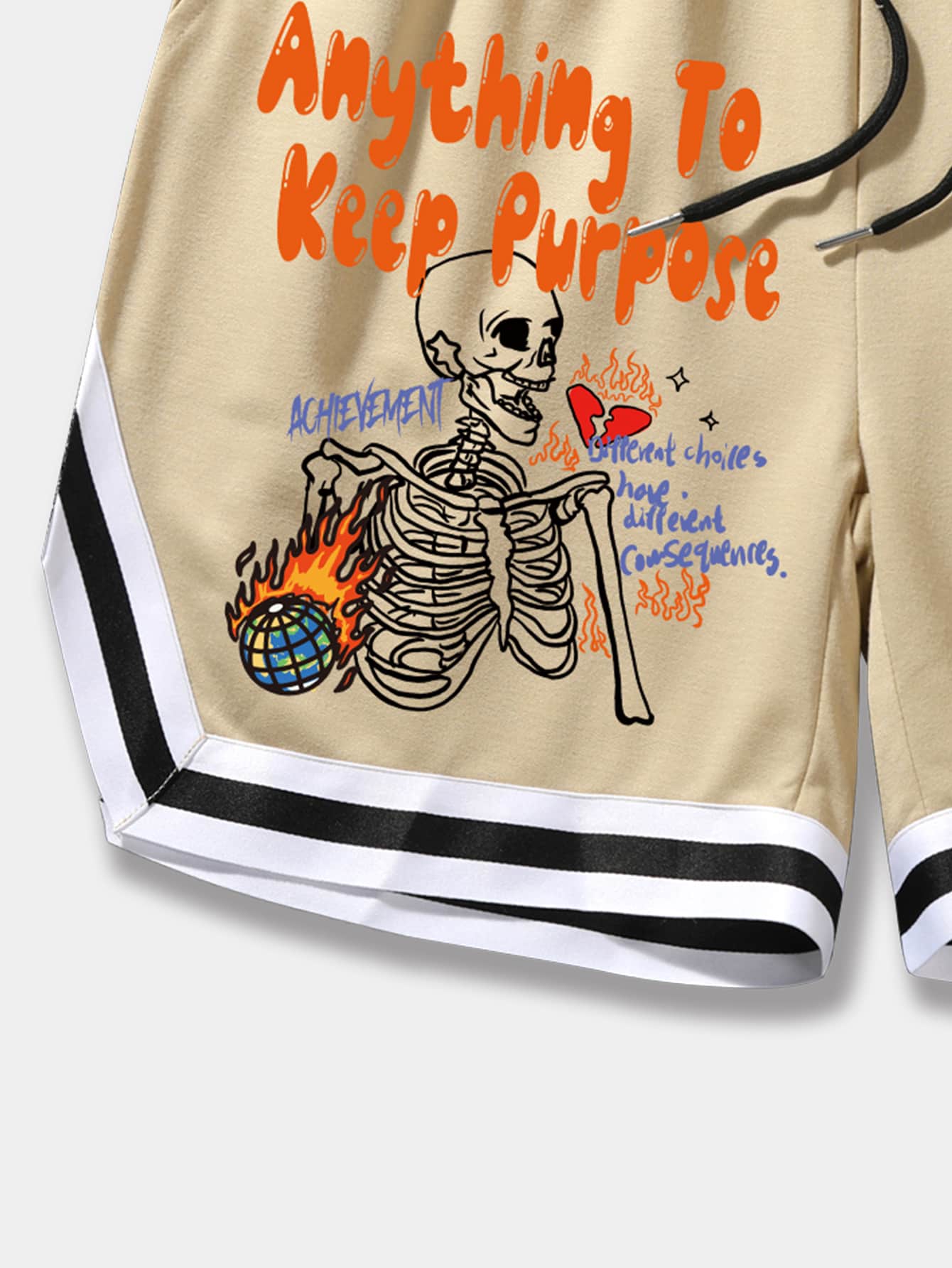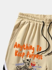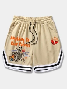 Street Life Pantalones Cortos Para Hombre De Cintura Con Cordón, Diseños De Esqueleto Y Eslogan Con Ribete A Rayas