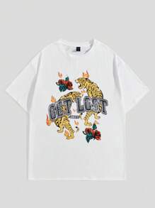 Street Life Hombres Camiseta de hombros caídos con estampado de tigre y letra